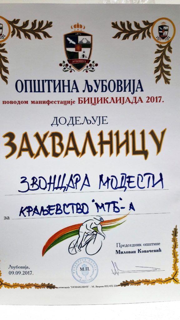 Ljubovijska se mladost u subotu, 9. septembra 2017. okupila u dvorištu osnovne škole “Petar Vragolić”. Škola je u daljini okružena vrhovima planina i kao da se i sama nalazi na nekoj travnatoj zaravni. Čini mi se da sam ovde tek na kratko zastala: da otpijem gutljaj vode, još jednom duboko udahnem rezak planinski vazduh, pa odoh dalje – na biciklu, a kako drugačije?!