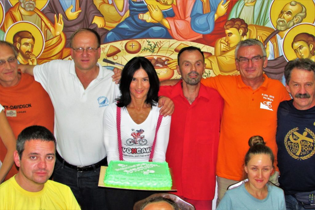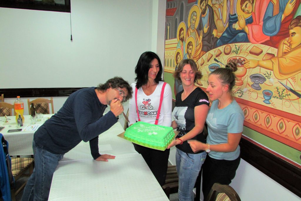 Uzbuđenje vlada na sve strane! Miki piše zahvalnice, lepim, stilizovanim slovima. Ne želi nikoga da izostavi, posebno se brine da oni koji su prvi put došli ne budu zanemareni na bilo koji način. Kaže: “Vi, “stari”, mi nećete zameriti, vi ste već na neki način i domaći, pomozite da svi odavde ponesu najlepše uspomene”! Evo, ja pomažem: čim smo završili sa večerom odmah sam ušla u kuhinju, kao “stara”, i pitala kad će torta.. Polako, stani malo, ima valjda neki red, i treba da se poštuje! Miki deli zahvalnice, pehare ručno rađene od delova bicikala, ili one “prave”, ne tako originalne, izlivene u livnici, a sve s posvetom. Mnogo je urnebesnog smeha, i, ono što je najvažnije, zajedništva! Dakle, baš smo kao u priči o musketarima: “Svi za jednoga, jedan za sve!”. Muk je nastao kad smo minutom ćutanja odali poštu našem prijatelju, Gordanu Vujisiću – Šici, koji je prošle godine bio ovde s nama, zajedno smo se veselili, a na neki drugi svet, il’ ko zna gde, otišao tako što je zastao, seo pored svog bicikla i više nije ustao… Šico, neka ti je laka crna zemlja…
