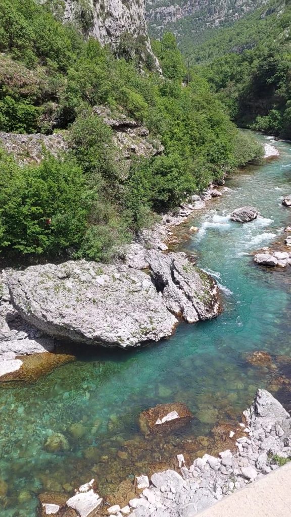 Brzo smo iza sebe ostavili podgoričke ulice i gradsku vrevu i ušli u Park prirode Kanjon Cijevne. Vozimo pored predivne reke svih nijansi modre, plavičaste i zelenkaste. Jedna od najlepših i najčistijih evropskih reka. Biserne suze Prokletija. Tako je zovu. Kamenčići beli, sivi, ili još tamniji, davali su joj neobičan odsjaj, a sunce koje je snažno sijalo (i nemilice pržilo) još je više doprinosilo iskričavosti reke. To se sve boje bisera prelamaju i prave mrežu najčistijih suza.. Milina… Uživamo.. Nailazimo na grupice kupača, a i mi smo se u nekoliko navrata spuštali do reke. Prijala je njena svežina.