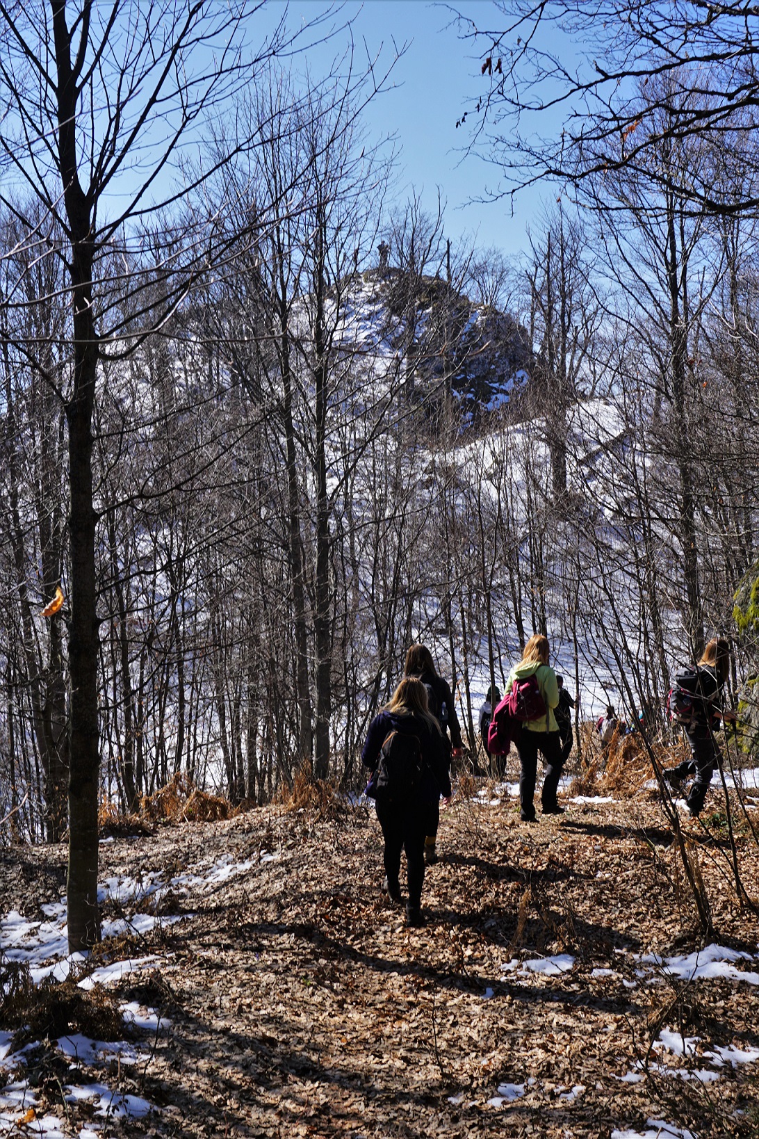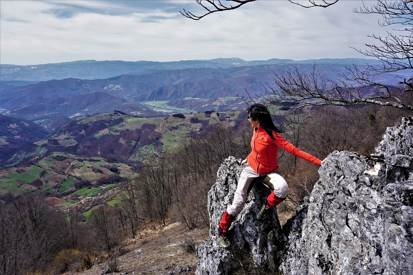 Već po izlasku iz autobusa, nakon početnih stotinjak metara blagog uspona, počinjemo da se oslobađamo viška garderobe. Sve je toplije, odlično smo raspoloženi, brzo se krećemo, idemo kolskim putem, pa preko livade, nastavljamo, zalazimo u šumicu, pa prema Crvenoj steni, vrhu na 1196 mnv. Uspon je malo ekstremniji, otežava ga klizav sneg, ali nema žurbe, vodiči su smireni, odaju sigurnost. Na vrhu smo nagrađeni suncem i pogledom na Taru, Drinu i planine Istočne Bosne. Okupirali smo nazubljene kamene formacije sa kojih se pogled gubi u bezdanu, zadržali se 20ak minuta, pa nastavili prema Svilenoj steni, najvišem vrhu Gvozdačkih stena, na 1231 mnv. Još jedan predivan vidikovac i pogled na Drinu koja meandrira, a iza nje se nadvija raskoš planinskih vrhova. Danas je dan na uživanje.