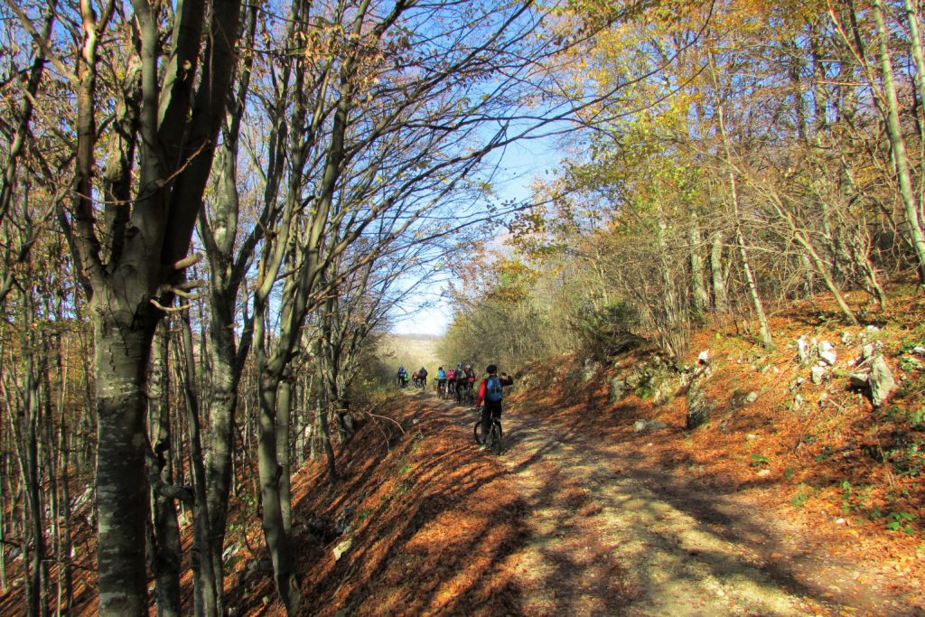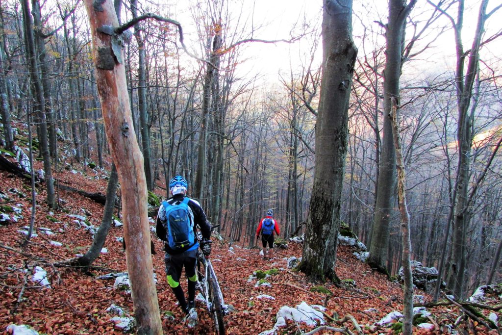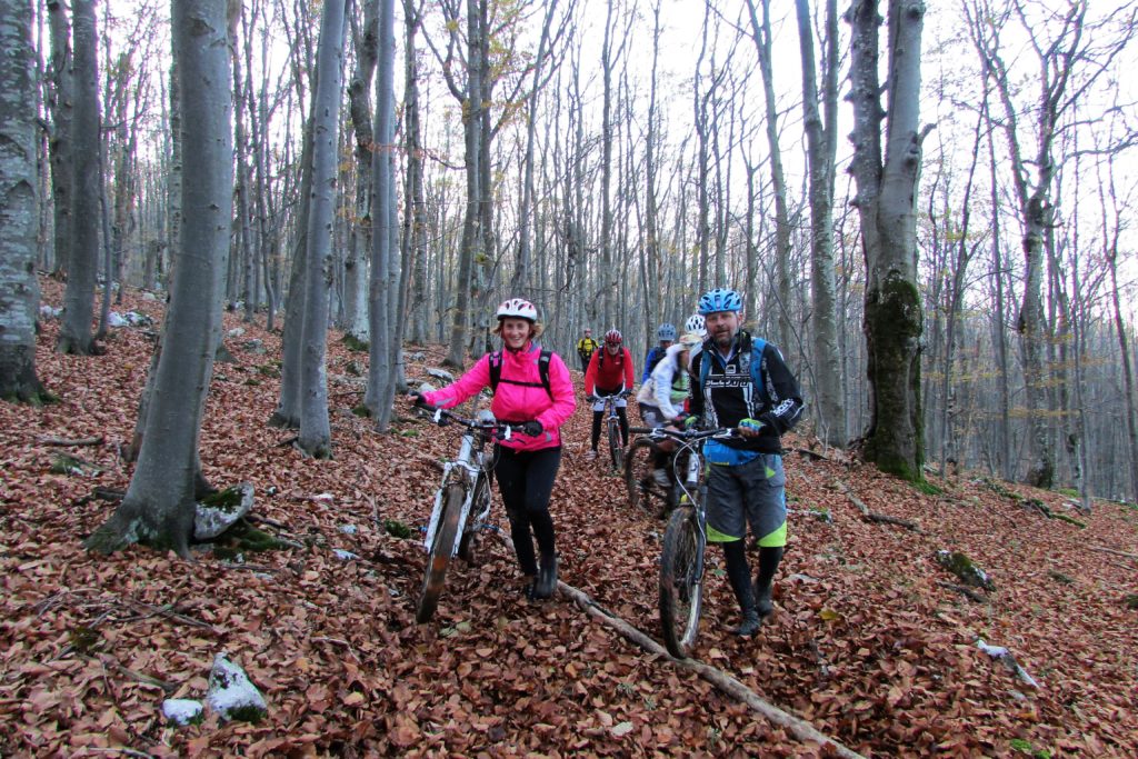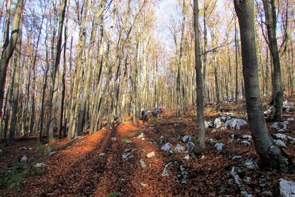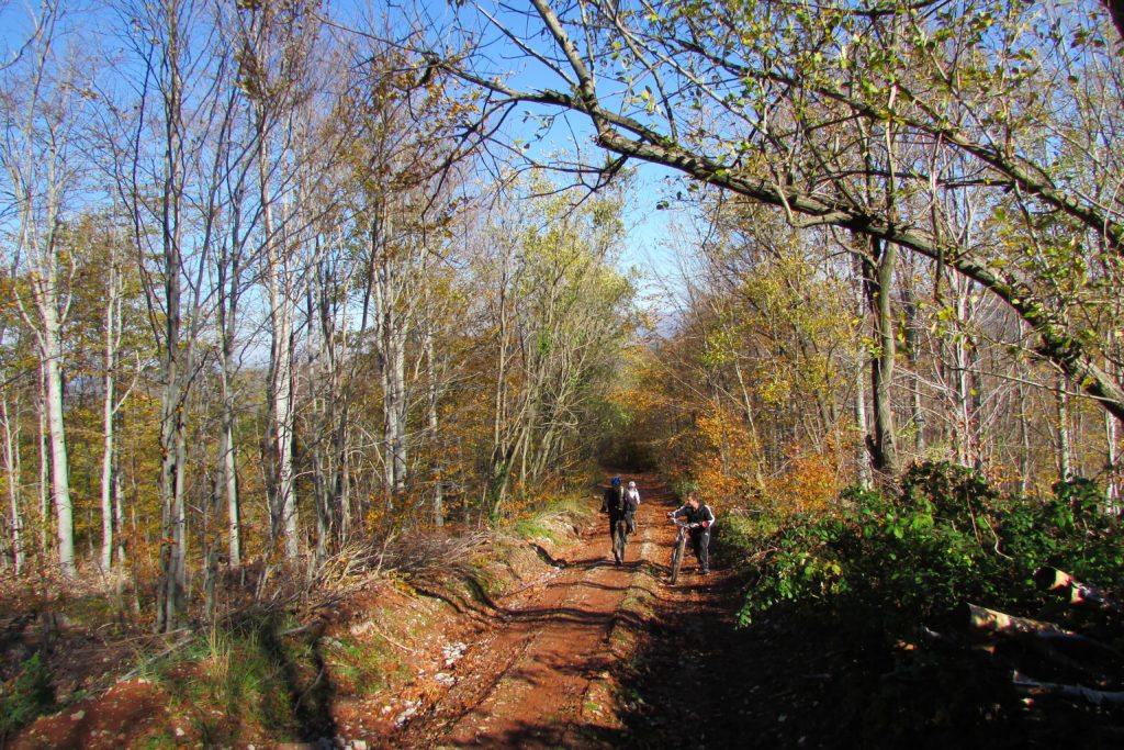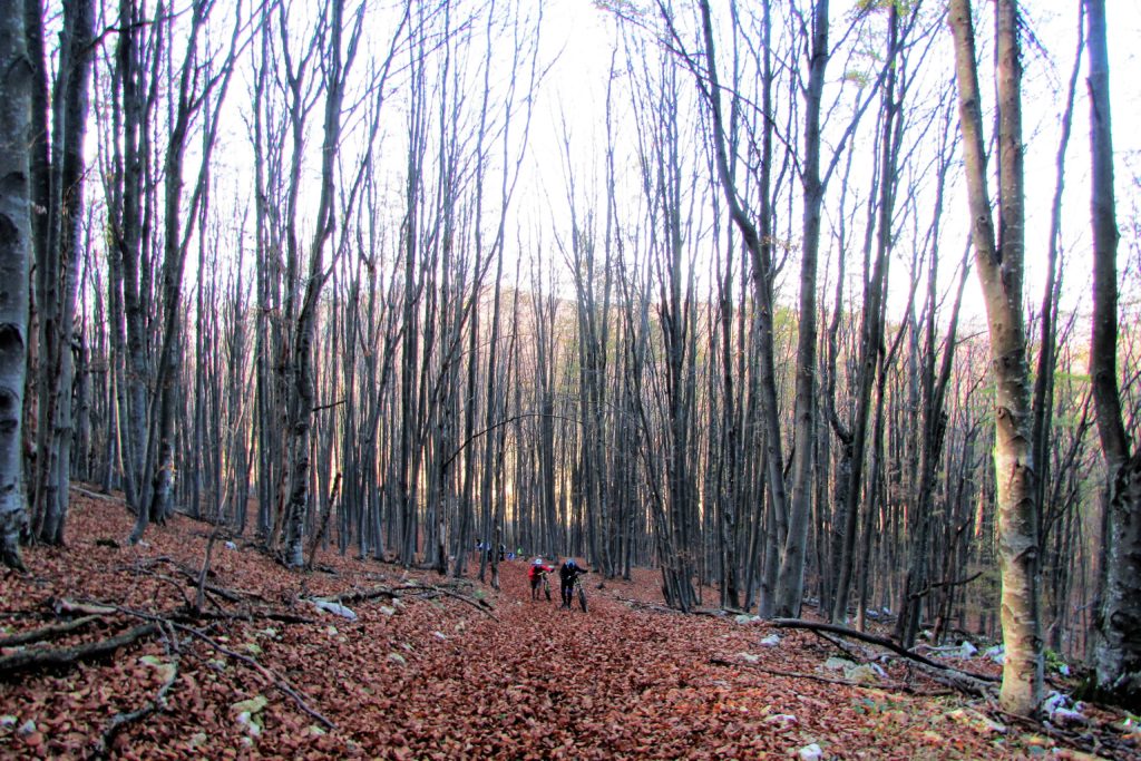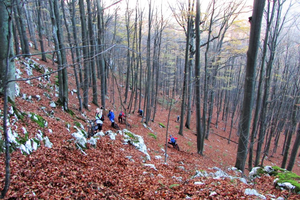 Kad smo konačno izašli iz tog užasa, zauzeli smo jednu osunčanu livadu i tu malo očistili bicikle i obuću. Usledio je blagi uspon, a zatim ulazak u prelepu bukovu šumu. Tu staze nema, i ispočetka smo uspevali da vozimo, međutim je to kratko trajalo. Došli smo do dela kroz koji smo samo mogli da se provlačimo, jer je šuma bila izuzetno bogata drvećem i granjem, vlažnim lišćem, kamenjem i oblutcima, posvuda “razbacanim”. Već je pola tri, mrak pada za, otprilike, dva sata, i trebalo bi što pre pronaći izlaz iz šume. Svi znamo da je put “tu negde”, ali nikako doći do njega… Izlazimo iz šume, ali sad su nove prepreke: stene koje preskačemo, provlačimo se između njih, zaobilazimo ih. Bicikle tu ne možemo čak ni da guramo, uglavnom ih prenosimo.