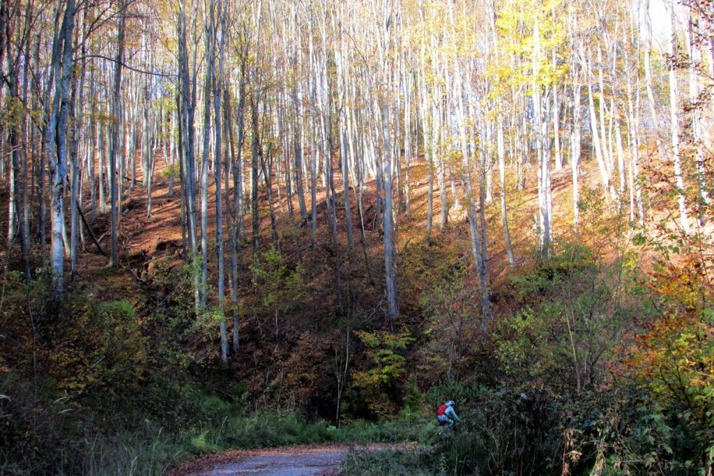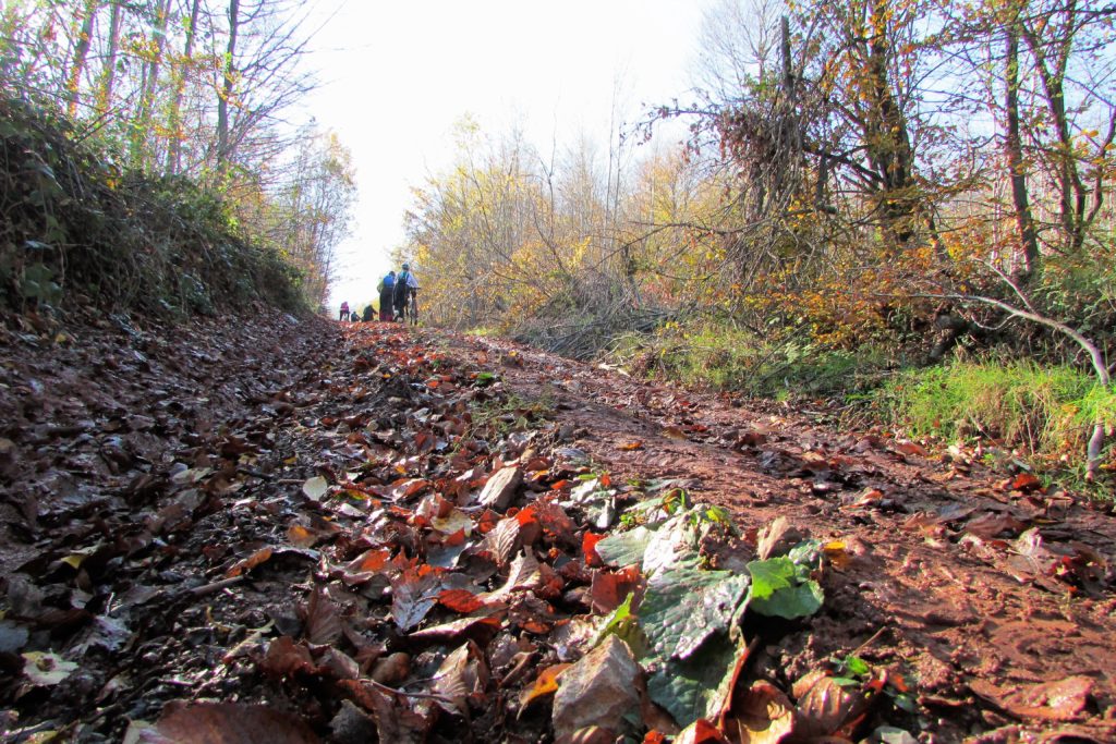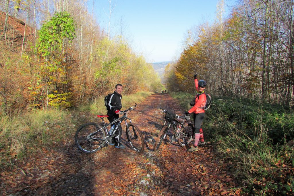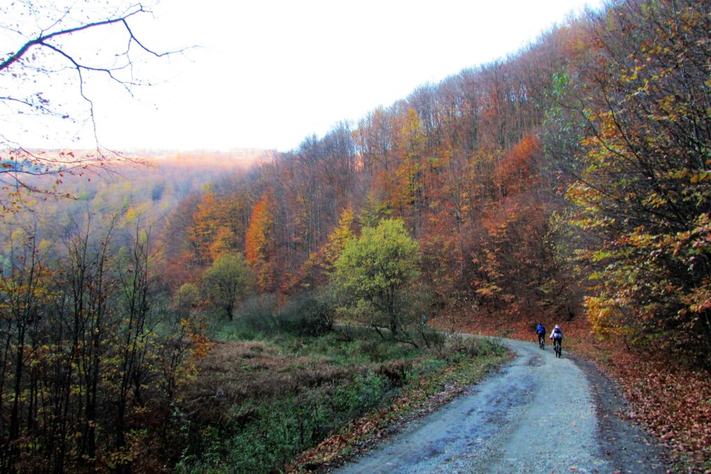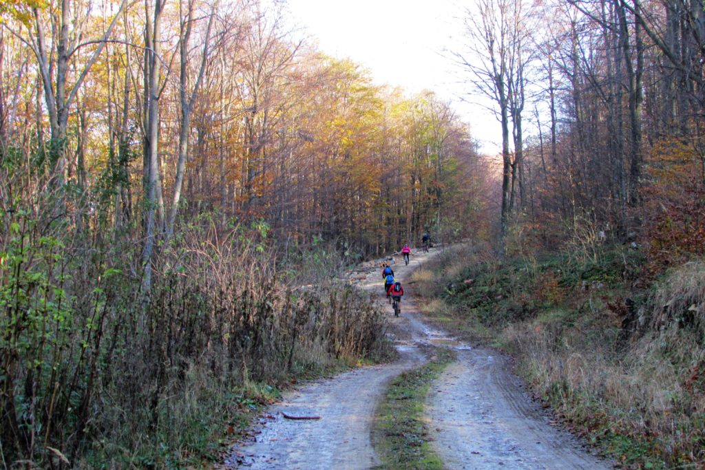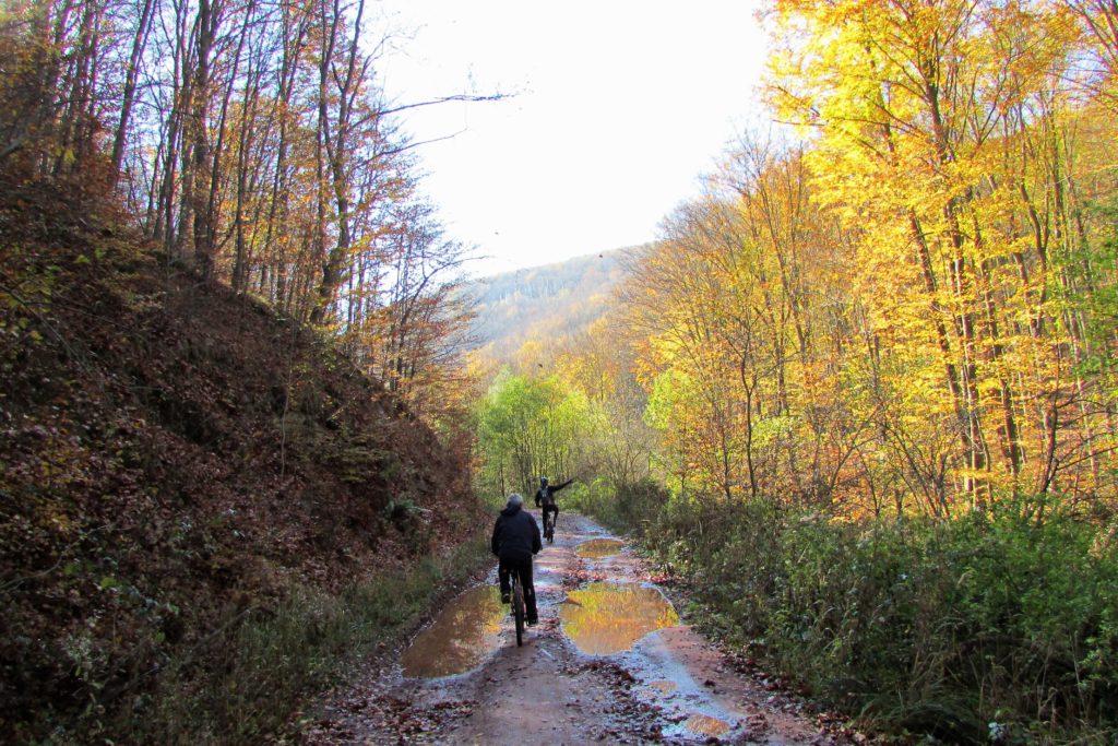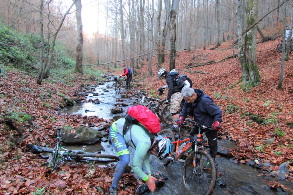 Kad smo konačno izašli iz tog užasa, zauzeli smo jednu osunčanu livadu i tu malo očistili bicikle i obuću. Usledio je blagi uspon, a zatim ulazak u prelepu bukovu šumu. Tu staze nema, i ispočetka smo uspevali da vozimo, međutim je to kratko trajalo. Došli smo do dela kroz koji smo samo mogli da se provlačimo, jer je šuma bila izuzetno bogata drvećem i granjem, vlažnim lišćem, kamenjem i oblutcima, posvuda “razbacanim”. Već je pola tri, mrak pada za, otprilike, dva sata, i trebalo bi što pre pronaći izlaz iz šume. Svi znamo da je put “tu negde”, ali nikako doći do njega… Izlazimo iz šume, ali sad su nove prepreke: stene koje preskačemo, provlačimo se između njih, zaobilazimo ih. Bicikle tu ne možemo čak ni da guramo, uglavnom ih prenosimo.