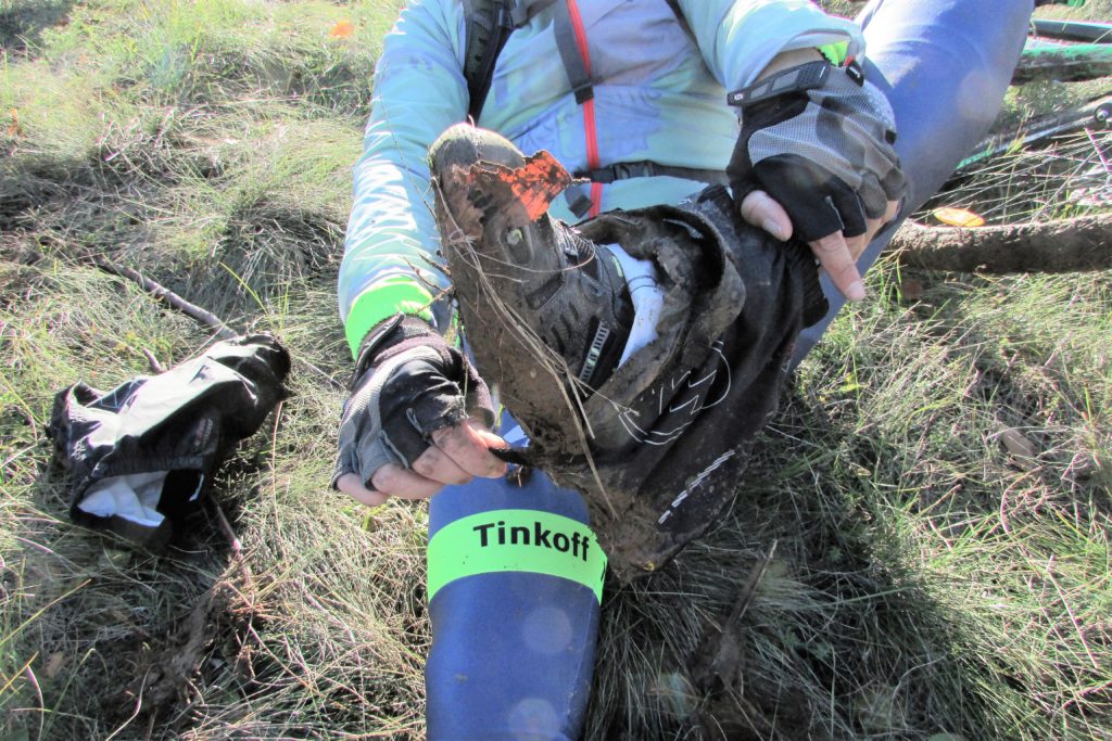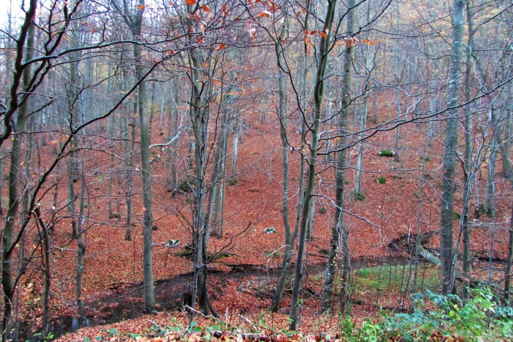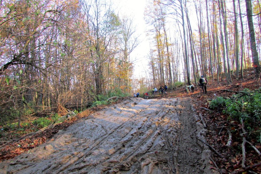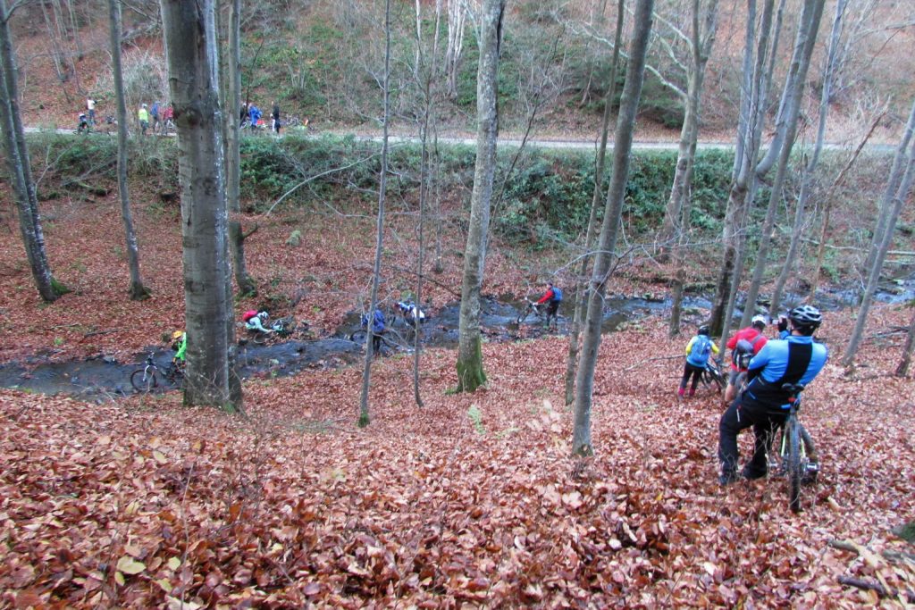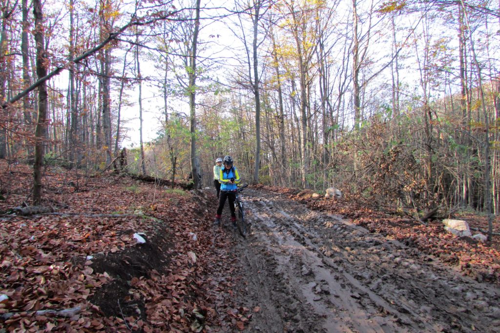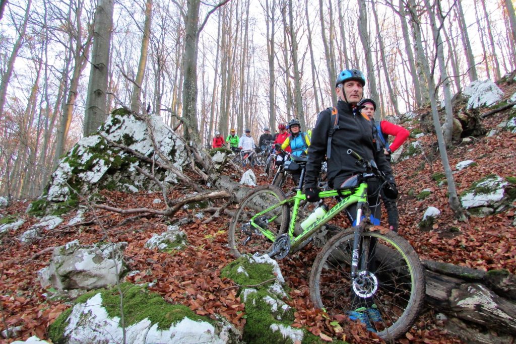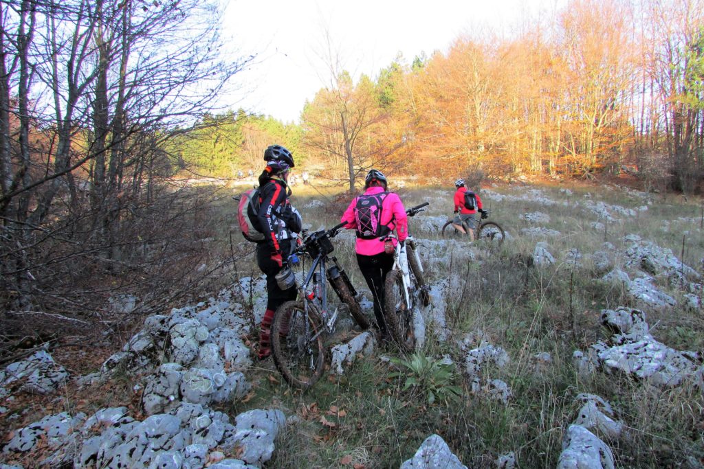 Kad smo konačno izašli iz tog užasa, zauzeli smo jednu osunčanu livadu i tu malo očistili bicikle i obuću. Usledio je blagi uspon, a zatim ulazak u prelepu bukovu šumu. Tu staze nema, i ispočetka smo uspevali da vozimo, međutim je to kratko trajalo. Došli smo do dela kroz koji smo samo mogli da se provlačimo, jer je šuma bila izuzetno bogata drvećem i granjem, vlažnim lišćem, kamenjem i oblutcima, posvuda “razbacanim”. Već je pola tri, mrak pada za, otprilike, dva sata, i trebalo bi što pre pronaći izlaz iz šume. Svi znamo da je put “tu negde”, ali nikako doći do njega… Izlazimo iz šume, ali sad su nove prepreke: stene koje preskačemo, provlačimo se između njih, zaobilazimo ih. Bicikle tu ne možemo čak ni da guramo, uglavnom ih prenosimo.
