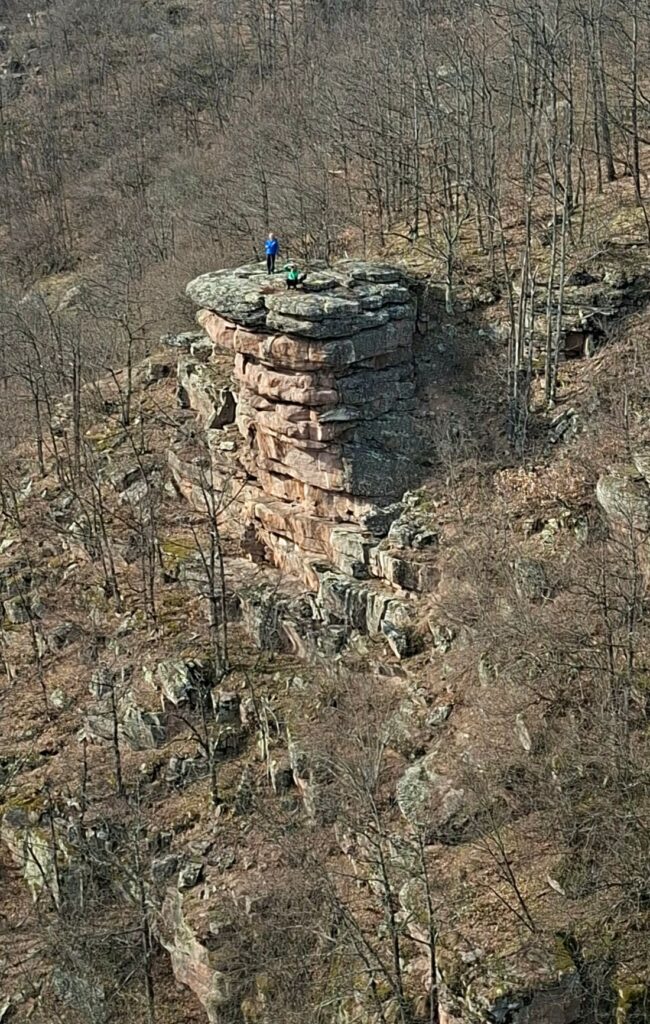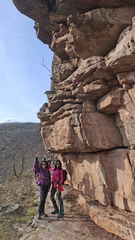 Stižemo do zanimljivog, prostranog platoa, a u stvari je to prirodna platforma i prvi od vidikovaca, zovu ga Mala Tumba. Ispod nas je ambis, ali kakav: meandri reke Temštice, hidroelektrana Temac, i put koji vijuga i hrli prema Toplom Dolu. Gledamo se sa šumama Stare planine, tek olistalim. Živod je čudo. A, onda – uzvici ushićenja, jer su preko puta nas, na (Veliku) Tumbu, vidikovac na 780 m n.v, upravo izašli neki od naših drugara i sada nam zadovoljno mašu. Hoćemo li i mi? Bez reči se, samo osmehom i očima, Ivana i ja dogovaramo. Idemo. Opet bez glasa: prosto je – idemo! Zalazimo u šumicu, kamenje je na sve strane, i malo klizavog sipara, puteljak se lagano spušta prema desno, pa nas vodi kroz jedan tesnac, među kamene gromade, pa drugi. Pazite, samo polako (to se misli roje), nema žurbe, valja ovde biti oprezan, dobro proceniti da li se rukom za kamen prihvatiti, da li napraviti duži, siguran korak, ili nekoliko kraćih. Drugari su tu za svaki slučaj, ako zatreba ruka podrške. Stižemo do drvenih merdevina koje je neko, ko zna ko i ko zna kada, ovde postavio, da premosti nezgodan deo između dve gromadne stene.