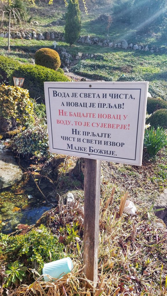 Još nam se jedno pitanje nametnulo: gde je Bogorodičina bašta? „Odmah prekoputa“ – rekoše nam monahinje, i tako smo došli do dva izvora bistre lekovite vode uklopljena u lepo uređenu baštu i s nekoliko natpisa. Jedan od njih kaže: Voda je sveta i čista, a novac je prljav! Ne bacajte novac u vodu, to je sujeverje! Ne prljajte čist i sveti izvor Majke Božije! Inače, u ovoj se izvorskoj vodi, koja je uvek temperature 12 stepeni, vrši i obred krštenja.