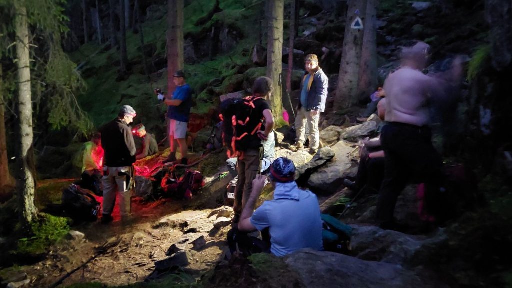 Okruženi smo zvukovima šume koja se budi, ptice su spremne za novi dan, a nadali smo se da mede nismo probudili. Pažnju nam skreće reka koja blista pod odlazećom mesečinom, ponosna je, susreće se s našim zadivljenim pogledima. Mnogobrojni slapovi prelaze preko kamenih oblutaka, upotpunjuju idilu šume. Pravimo kratku pauzu. Sedimo na razbacanom kamenju i popadalom drveću. Prizor je nestvaran… Gde smo… Kako je ovde dobro… Šuma nas zaklanja od vetra, zemlja diše i deli s nama svoju topolotu. Sve je ove noći uz nas.